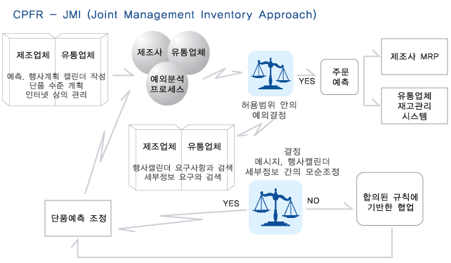 Joint Management Inventory Approach. JMI방식에 의한 상품 보충체계는 협업 시스템으로서 인터넷에서의 정보 공유를 포함하여 비독점적인 방식의 정보 공유 수단을 사용하고 유통업체와 제조업체 간에 업무 프로세스의 통합 정도에서 큰 차이를 갖는다. 결국 폭 넓은 정보를 동적으로 공유하여 계획에서 예측까지 전체 진행을 파트너가 공동 대응할 수 있다. 예를 들어 점포 단위에서의 단품판매 예측을 제조업체와 유통업체가 공동으로 수행하여 사전 합의된 오차한도를 넘지 않을 경우 자동 발주가 이루어진다. 이러한 과정을 통해서 예측 정밀도와 예측 방식이 고도화된다.